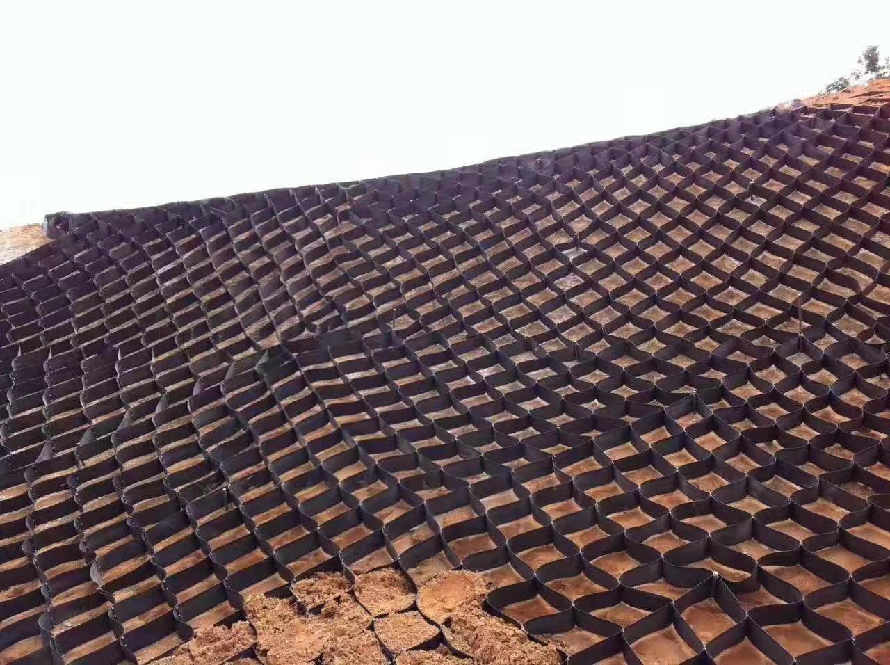 高强度土工格室:整供窗内为单根筋制作土工格室是由高强度的HDPE宽带,经过强力焊接而形成的一片网状格室结构。它伸缩自如,运输时可缩叠起来,使用时张开并又充填土石、或混凝土料,构成具有强大侧向限制和大刚度的结构体。它可用来做成垫层,处理软弱地基增大地基的承载能力,也可铺设在坡面上构成坡面防护结构,还可以用来建造支档结构等。这种材料施工也很方便格室高度为:5--50cm,网格尺寸根据客户需求制作。技术参数:抗拉强度≥150MPa,延伸率≤15%。