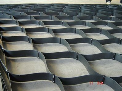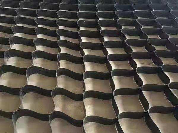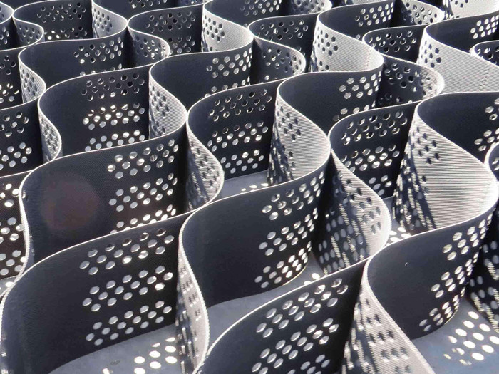 土工格室是由强化的HDPE片材料,经高强力焊接而形成的一种三维网状格室结构。一般经超声波针式焊接而成。因工程需要,有的在膜片上进行打孔。