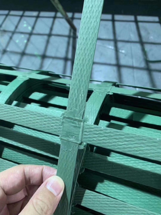钢塑土工格栅以高强钢丝(或其它纤维 ),经特殊处理,与聚乙烯(PE),并添加其它助剂,通过挤出使之成为复合型高强抗拉条带,且表面有粗糙压纹,则为高强加筋土工带。由此单带,经纵、横按一定间距编织或夹合排列,采用特殊强化粘接的熔焊技术焊接其交接点而成型,则为高强加筋土工格栅。