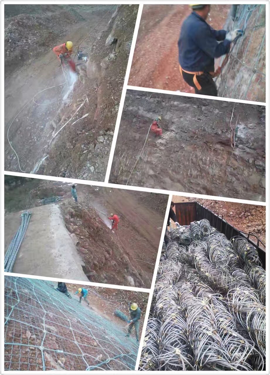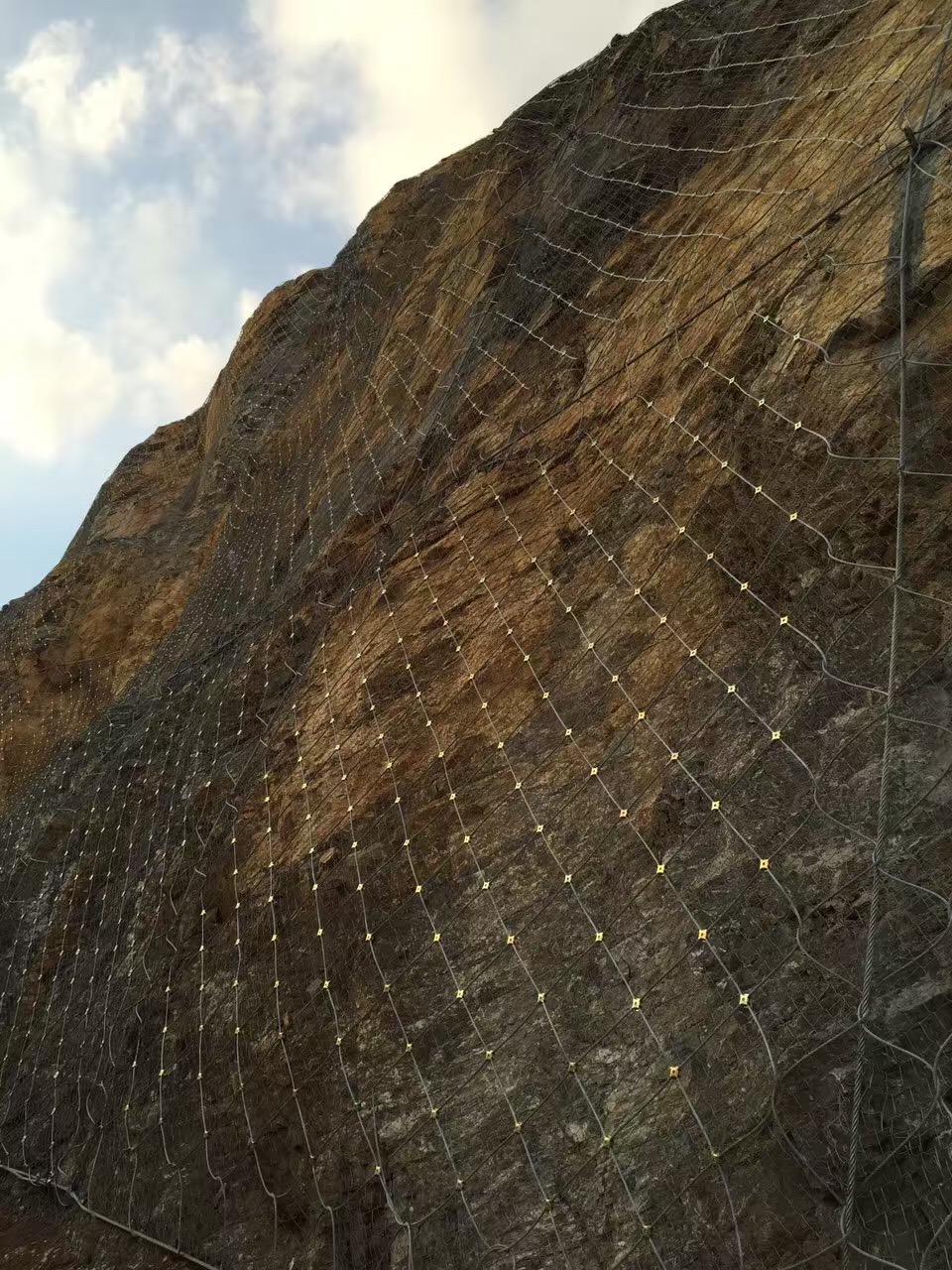 主动防护网采用高强度镀锌钢丝绳、钢丝网,不低于AB级的防腐处理,其防腐寿命根据环境条件的不同一般可达到30-50年不等,主要对边坡失稳潜在落石危险的坡面进行防治,以从横交错的Φ16支,按坡形4.5m*4.5m或4.8m*4.8m方形模式布置成网块,并用4m*4m的主动网用缝合绳进行预张拉,使该系统对坡面施以一定的方向预紧压力,从而提高危岩体的稳定性,阻止落石的发生,同时该系统下不会影响地下水的正常排泄,并给边坡的生态治理提供了先决条件。