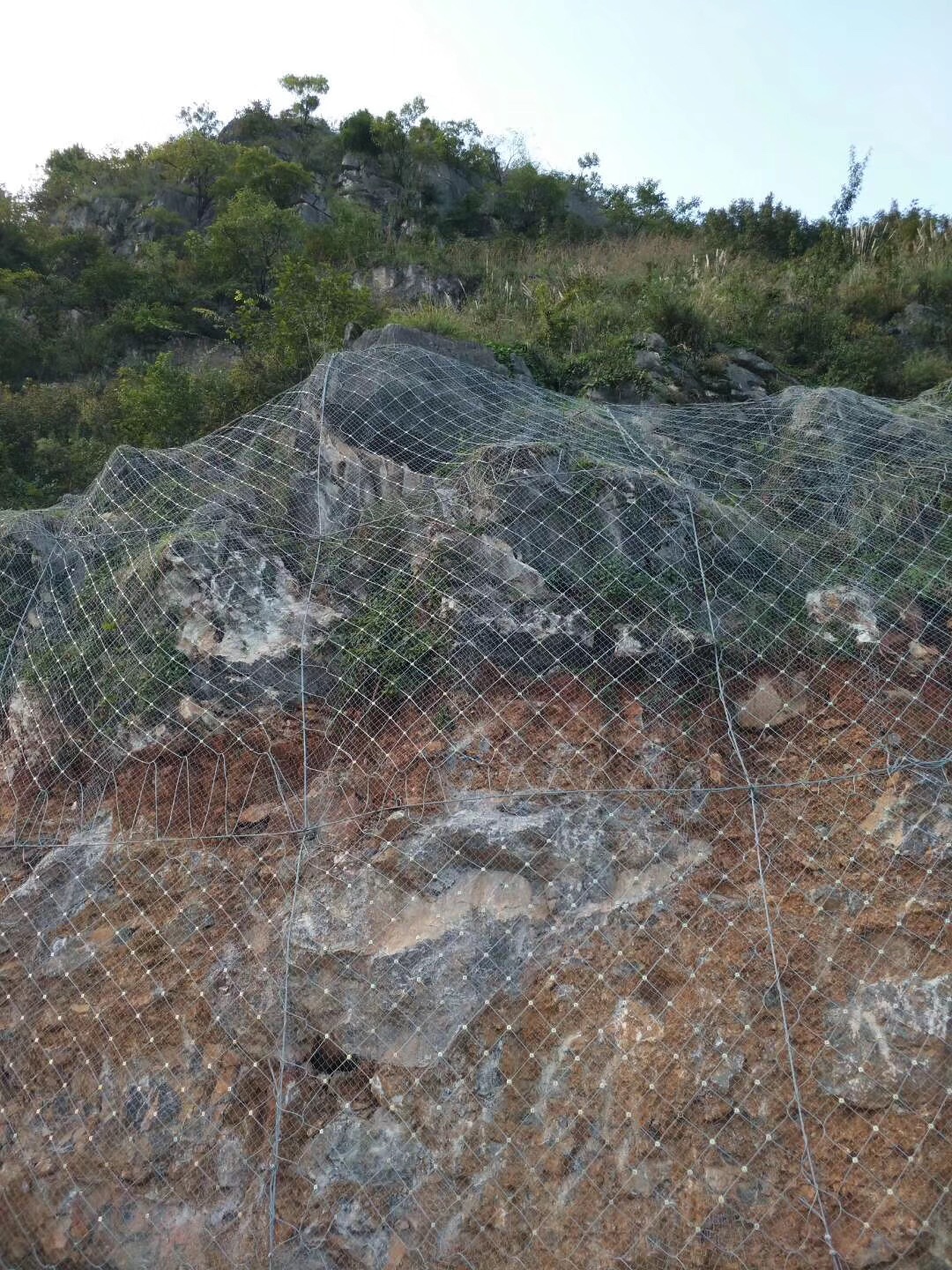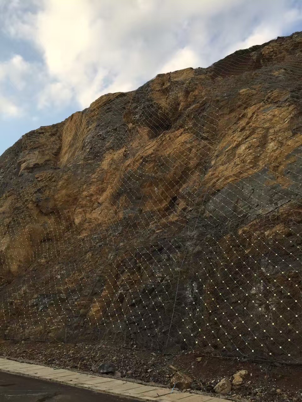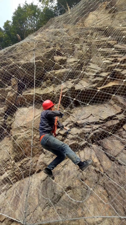 主动防护网采用高强度镀锌钢丝绳、钢丝网,不低于AB级的防腐处理,其防腐寿命根据环境条件的不同一般可达到30-50年不等,主要对边坡失稳潜在落石危险的坡面进行防治,以从横交错的Φ16支,按坡形4.5m*4.5m或4.8m*4.8m方形模式布置成网块,并用4m*4m的主动网用缝合绳进行预张拉,使该系统对坡面施以一定的方向预紧压力,从而提高危岩体的稳定性,阻止落石的发生,同时该系统下不会影响地下水的正常排泄,并给边坡的生态治理提供了先决条件。