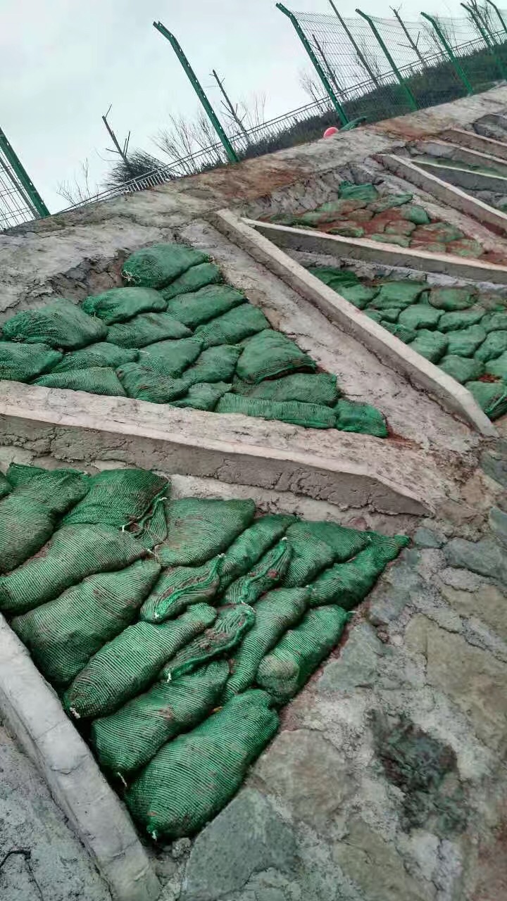 4、如果是接近垂直堆砌植生袋,每叠砌1米高时,应该在基面上打固定桩,用绳把这层草种植生袋绑紧、分别固定在固定桩上,防止墙体倒塌。做到以上4点草种植生袋护坡绿化效果佳。