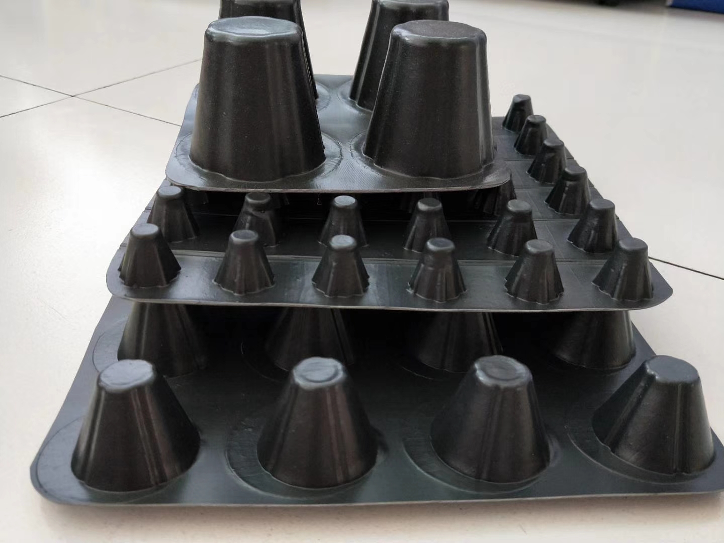 卷材排水板,也叫凹凸型塑料排水板或者凹凸排水板,主要用在种植屋面排水工程、地下管廊排水工程、隧道防渗工程等。凹凸型塑料排水板,也叫凹凸排水板,是以聚乙烯为主材,经过挤塑工艺,在平面膜上制出众多圆台形或者圆柱形凸起,从而形成的一种壳膜连续的塑料板材。在施工过程中,凸起朝向迎水面,配合土工布使用,就可以形成一个中空空间,用以排水、排气、保温、隔热。