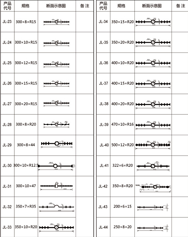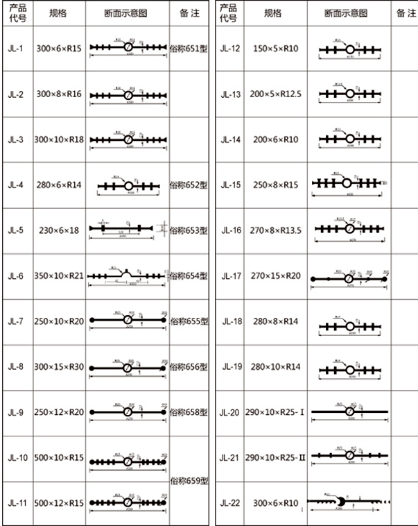 分类:按型号可分为:CB型橡胶止水带(埋入式中间有孔型);CP型橡胶止水带(埋入式中间无孔型);EB型橡胶止水带(外贴式中间有孔型);EP型橡胶止水带(外贴式中间无孔型)。