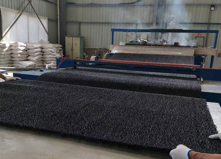 在热熔状态下,通过喷咀挤压出细的塑料丝条,再通过成型装置将挤出的塑料丝在结点上熔接,形成三维立体网状结构。也可上、下两面包覆无纺土工布。