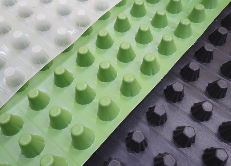 卷材排水板,也叫凹凸型塑料排水板或者凹凸排水板,主要用在种植屋面排水工程、地下管廊排水工程、隧道防渗工程等。凹凸型塑料排水板,也叫凹凸排水板,是以聚乙烯为主材,经过挤塑工艺,在平面膜上制出众多圆台形或者圆柱形凸起,从而形成的一种壳膜连续的塑料板材。在施工过程中,凸起朝向迎水面,配合土工布使用,就可以形成一个中空空间,用以排水、排气、保温、隔热。