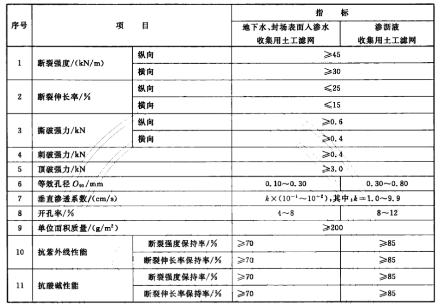 土工滤网规格表技术指标:(执行标准CJ/T 437-2013)