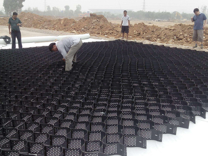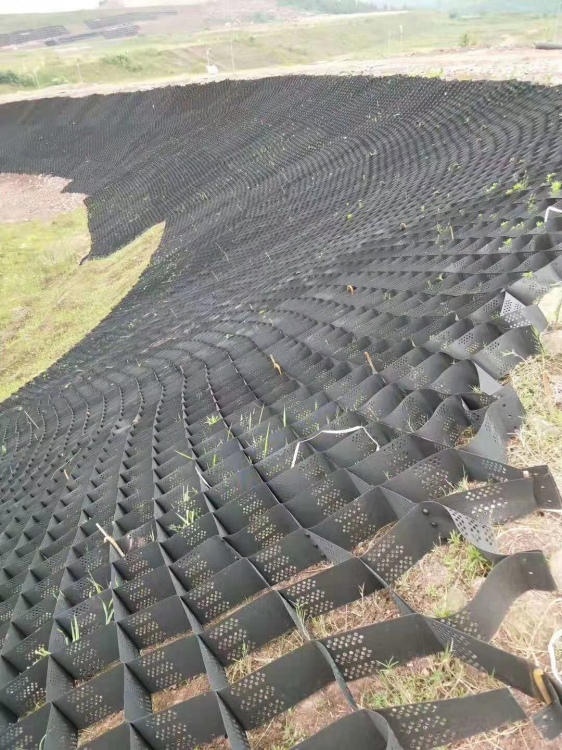 土工格室是由强化的HDPE片材料,经高强力焊接而形成的一种三维网状格室结构。一般经超声波针式焊接而成。因工程需要,有的在膜片上进行打孔。